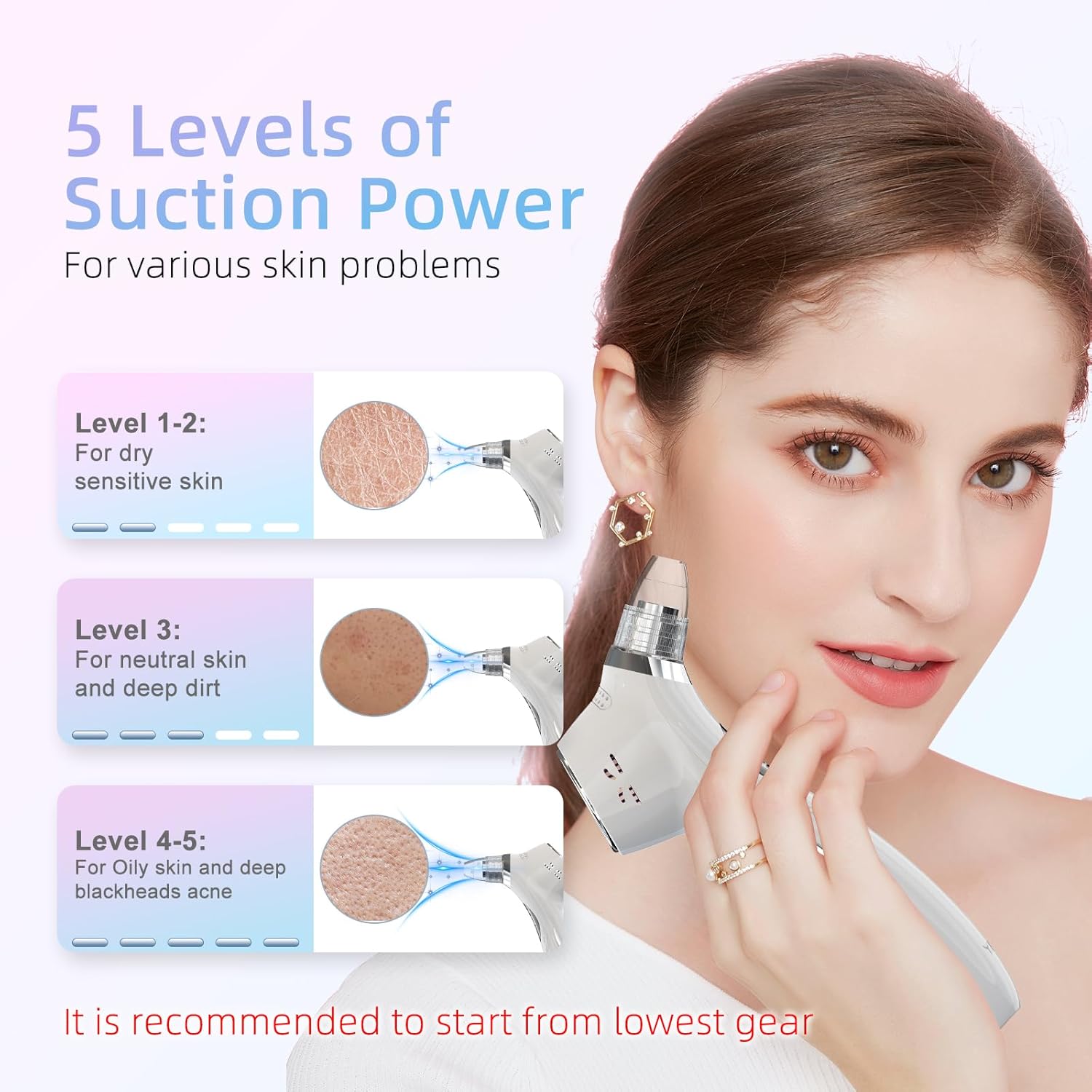 3 LEVELS OF SUCTION: The pore vacuum is designed for a variety of skin types. The light suction level 1 and level 2 are suitable for sensitive and dry skin. Use it with the small-hole beauty probe for the first time. The medium suction, level 3 is for neutral skin, oily skin. It is designed for combination skin with large pores.
